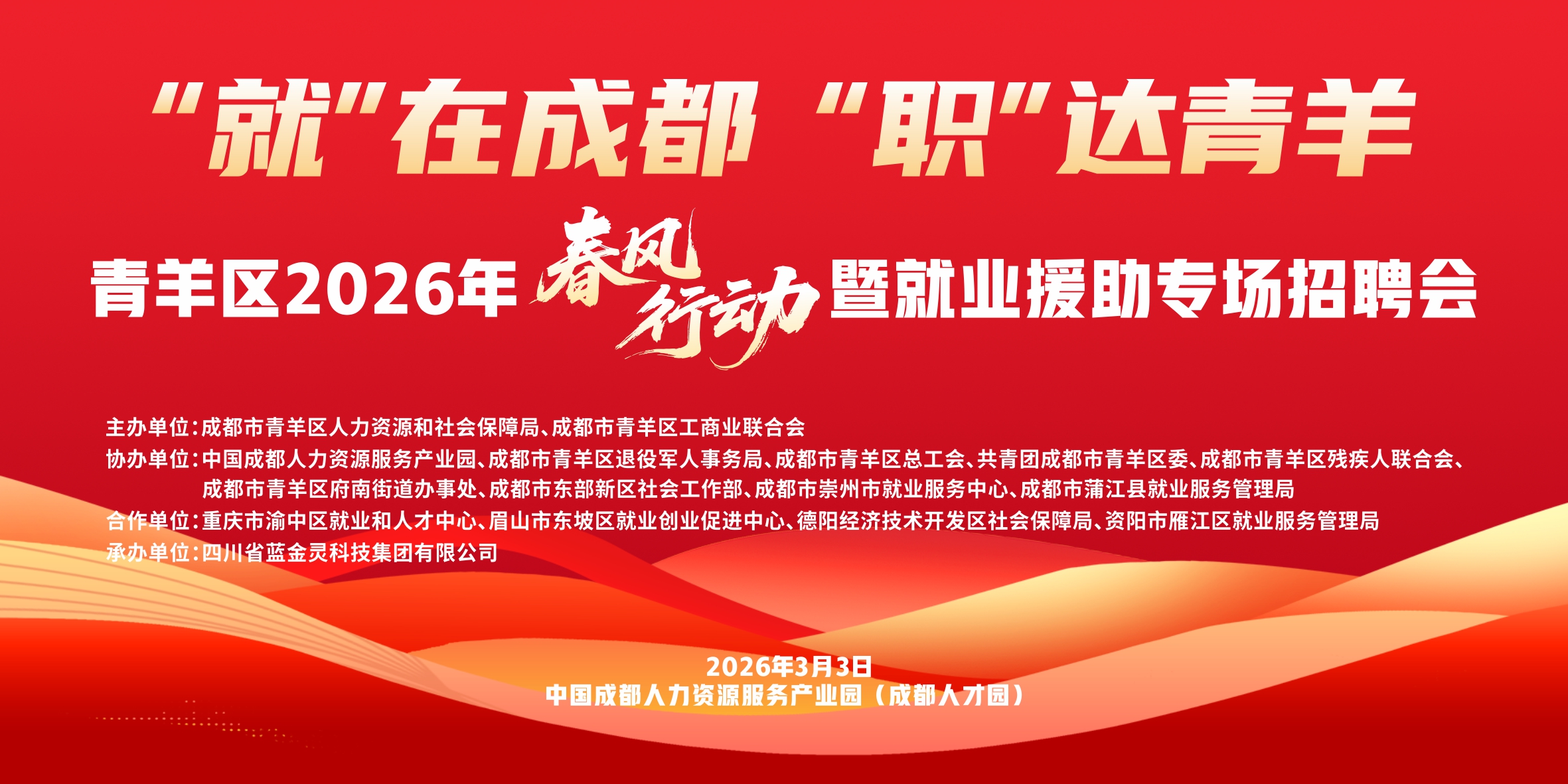 2026年3月3日,由成都市青羊区人力资源和社会保障局、成都市青羊区工商业联合会联合主办,成都市青羊区就业服务中心承办的青羊区2026年春风行动暨就业援助专场招聘会,将在中国成都人力资源服务产业园(成都人才园)南侧大厅广场暖心启幕!