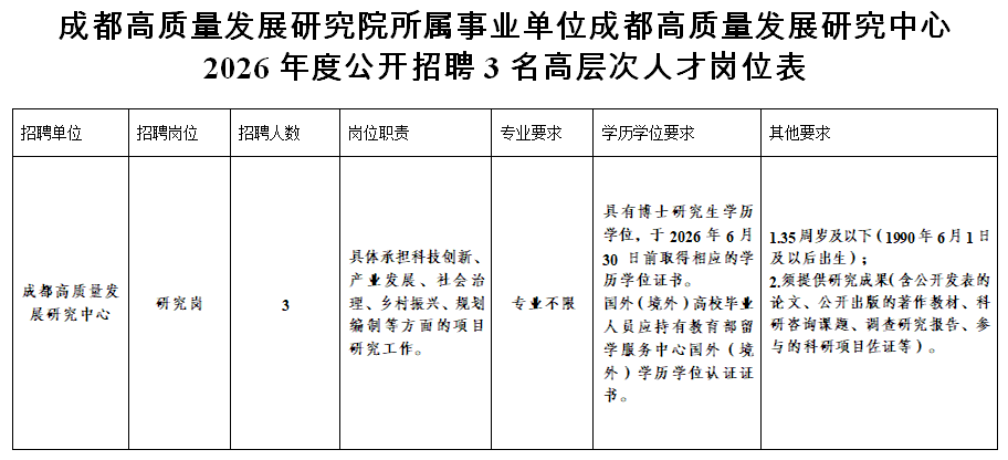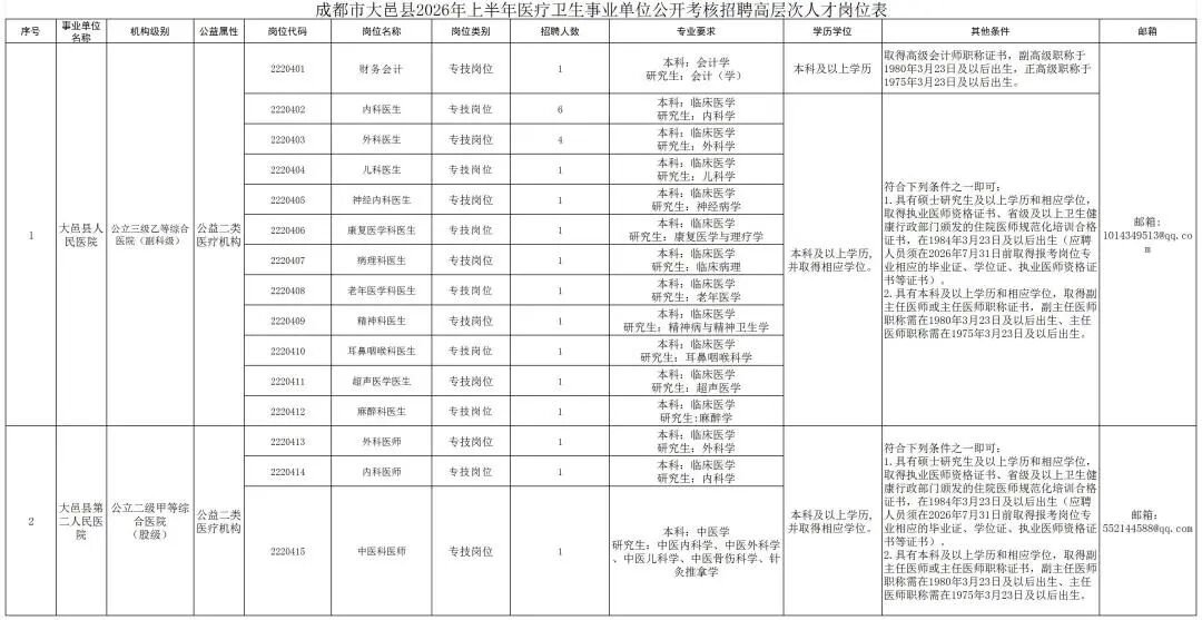 报名方式:应聘人员下载《成都市大邑县2026年上半年医疗卫生事业单位公开考核招聘高层次人才资格审查表》,填写各项内容并用A4纸竖式打印(本人签字)扫描后和其他相关材料扫描件电子版一并打包成一个文件发送至岗位表指定电子邮箱,文件以“姓名+报考单位+报考岗位代码”命名。